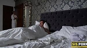 Slim blonde and stepbrother have unplanned sex after dinner