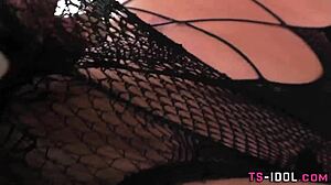 Stockinged Latin tranny in boots masturbates solo, tattooed and hairless, using toys for pleasure