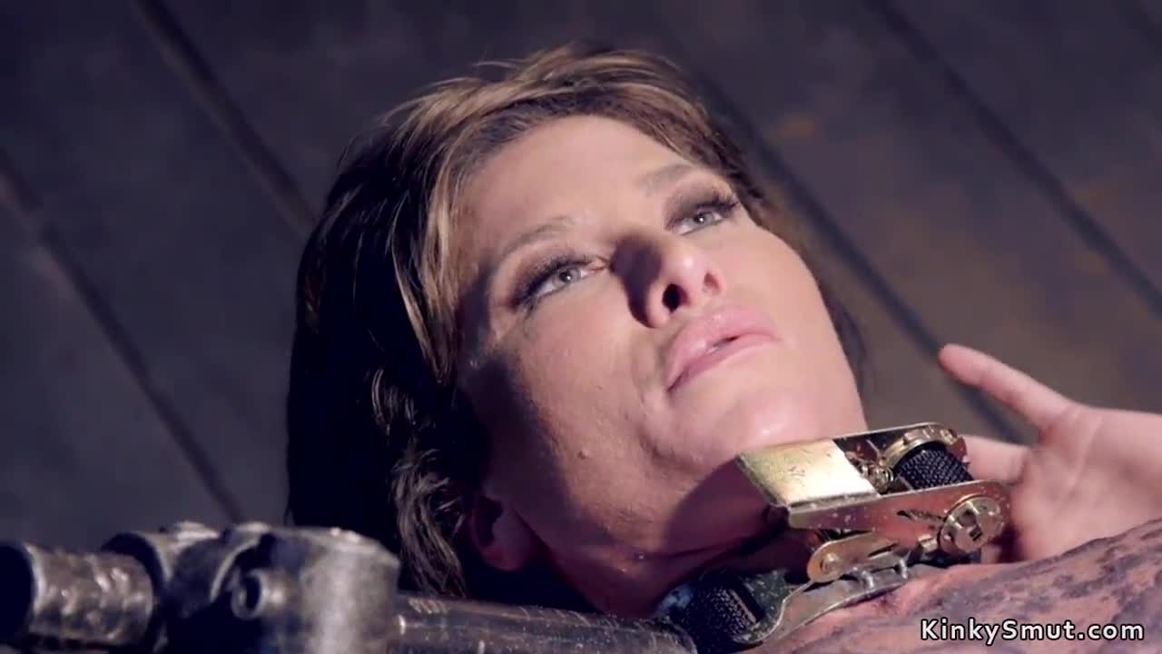 woman uses toy on restrained partner in bizarre fetish scene