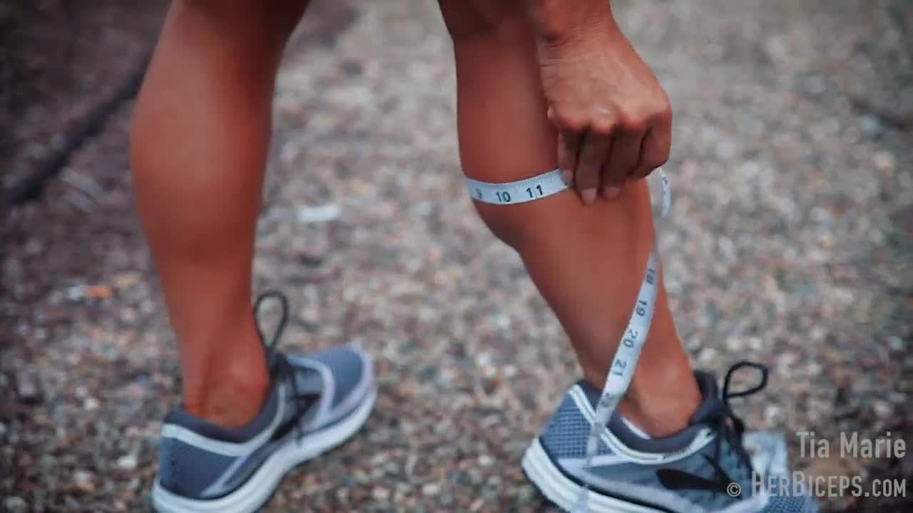 Tia marie flexes her muscular biceps during measurements -