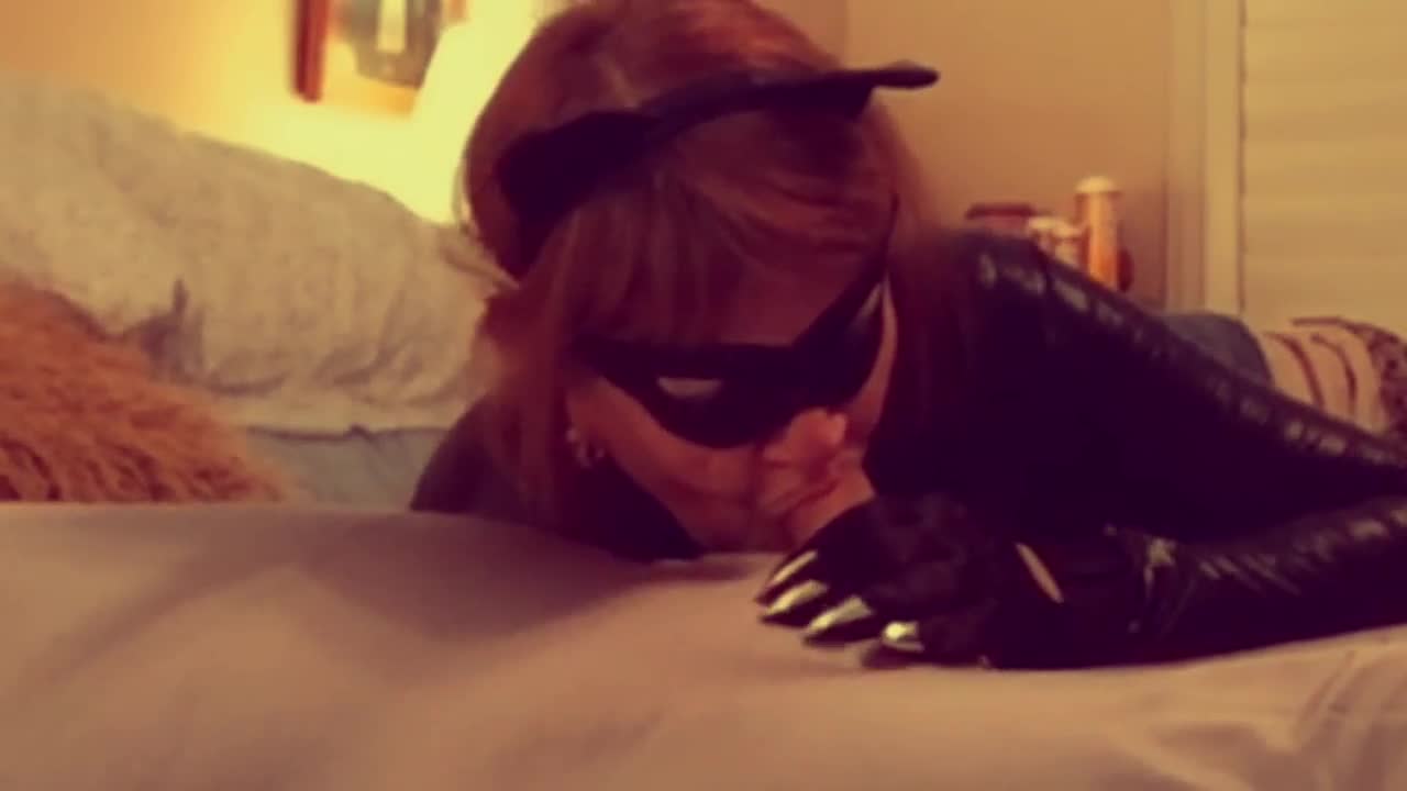 Catgranny in cosplay sucks batman's cock like a mature milf